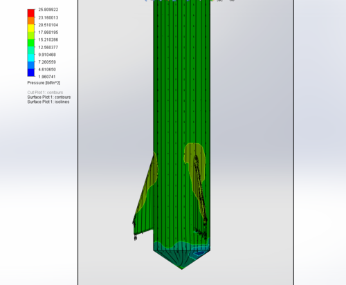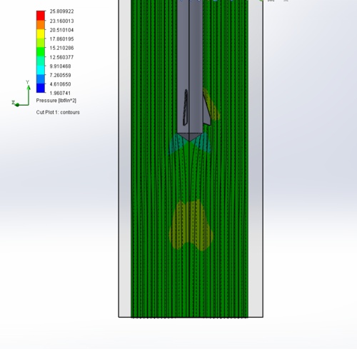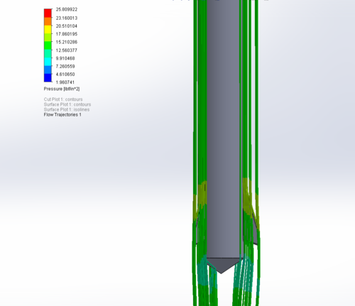 Flow Simulation of design in Solid Works. The main objective of this is to find the maximum pressure across the tip of the fin. Since the rocket is designed to be minimum diameter there are no fin tabs to anchor the fins into the motor mount. Thus the theoretical maximum pressure across the tip of the fin was need to determine the stress on the layups which laminates the fins to the main body tube.